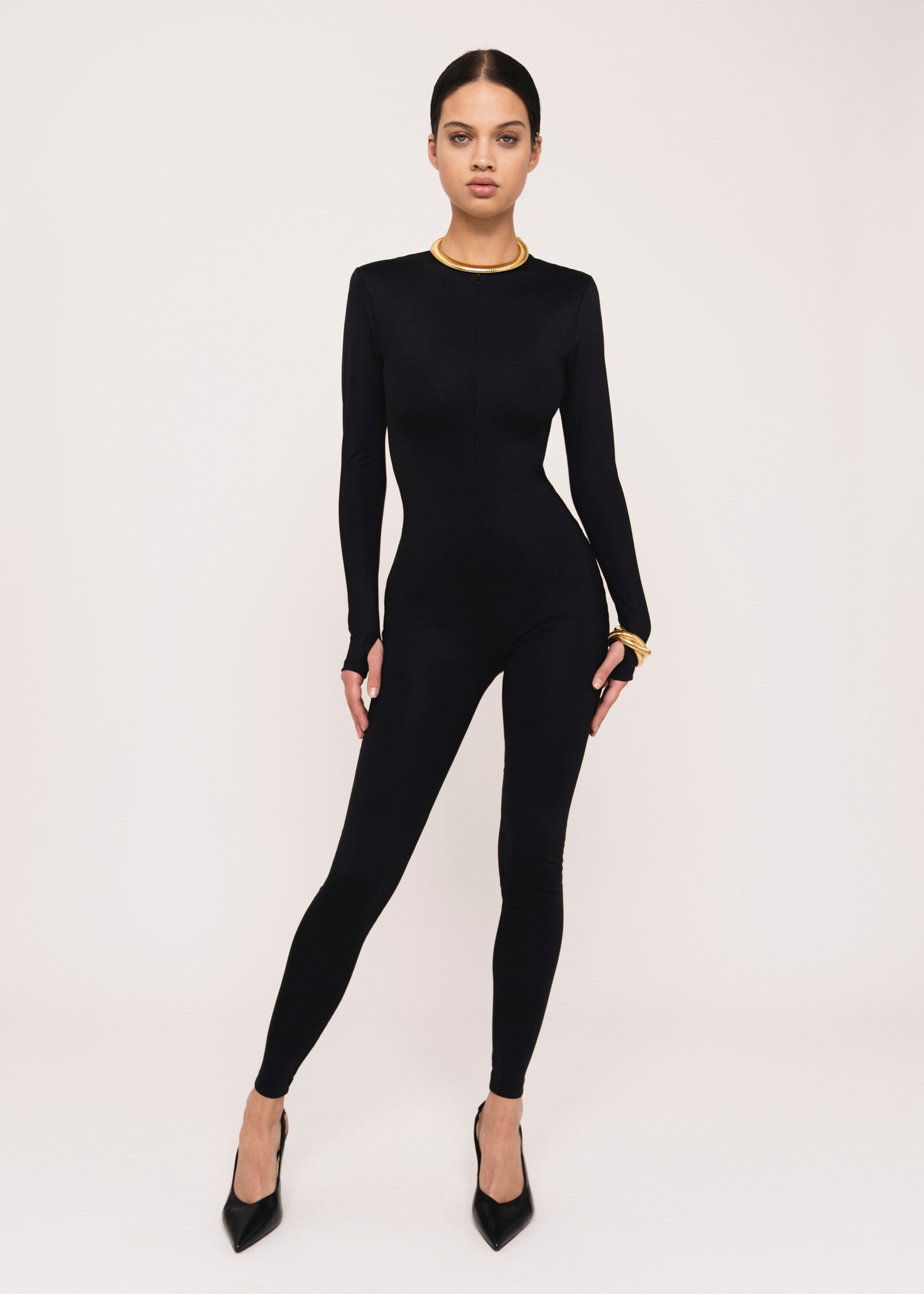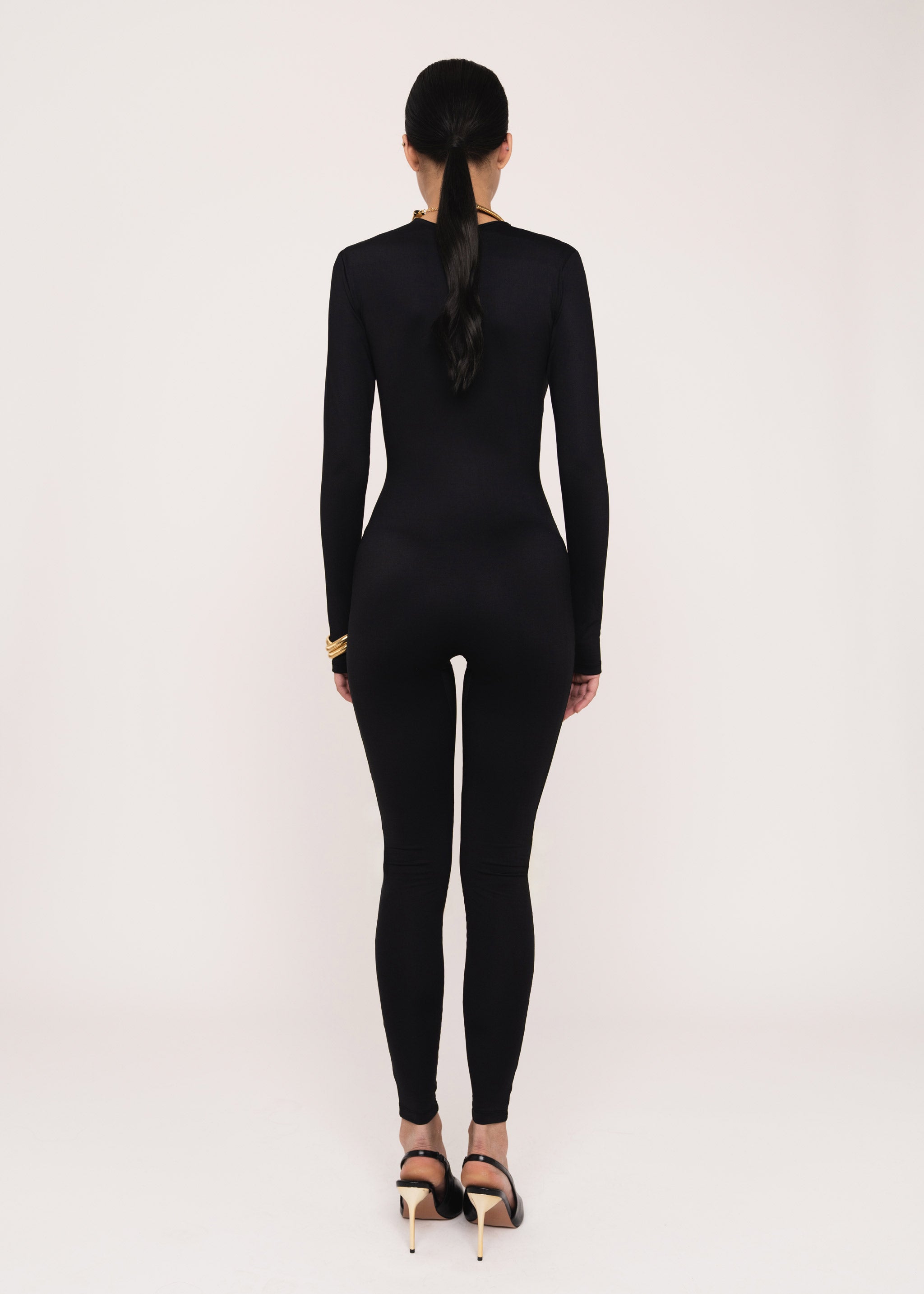 Form-fitting bodysuit with a zipper, accentuating the silhouette.