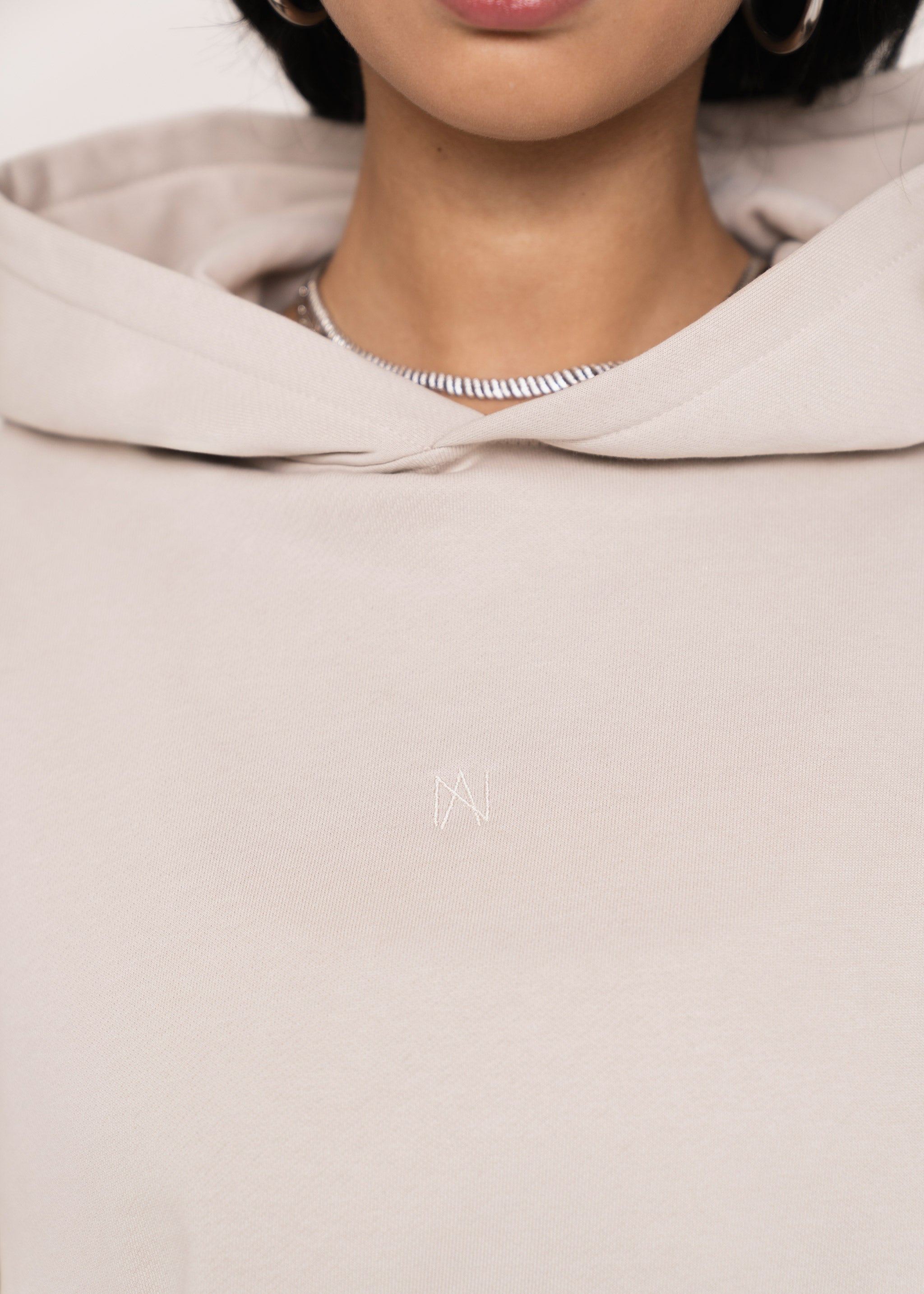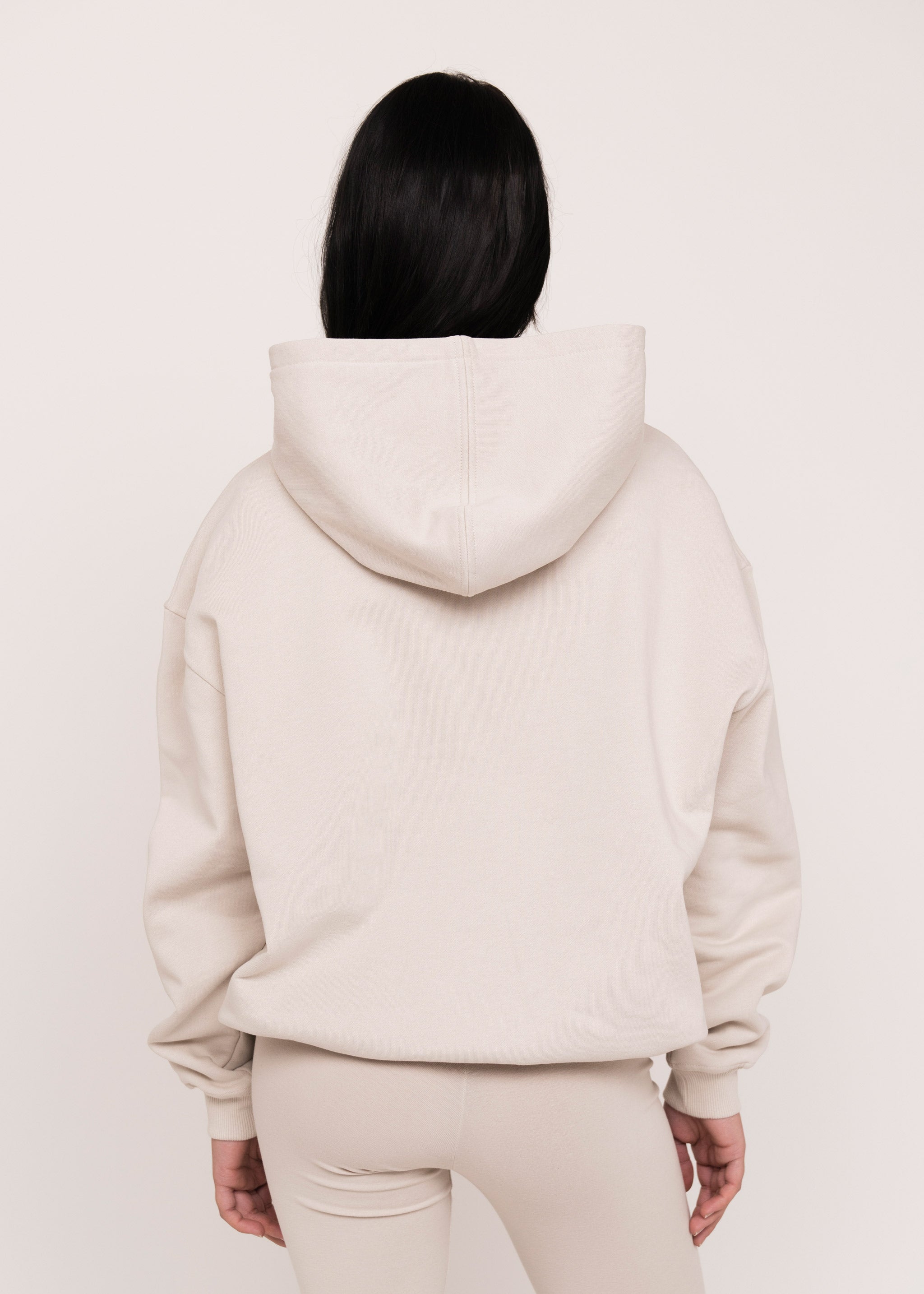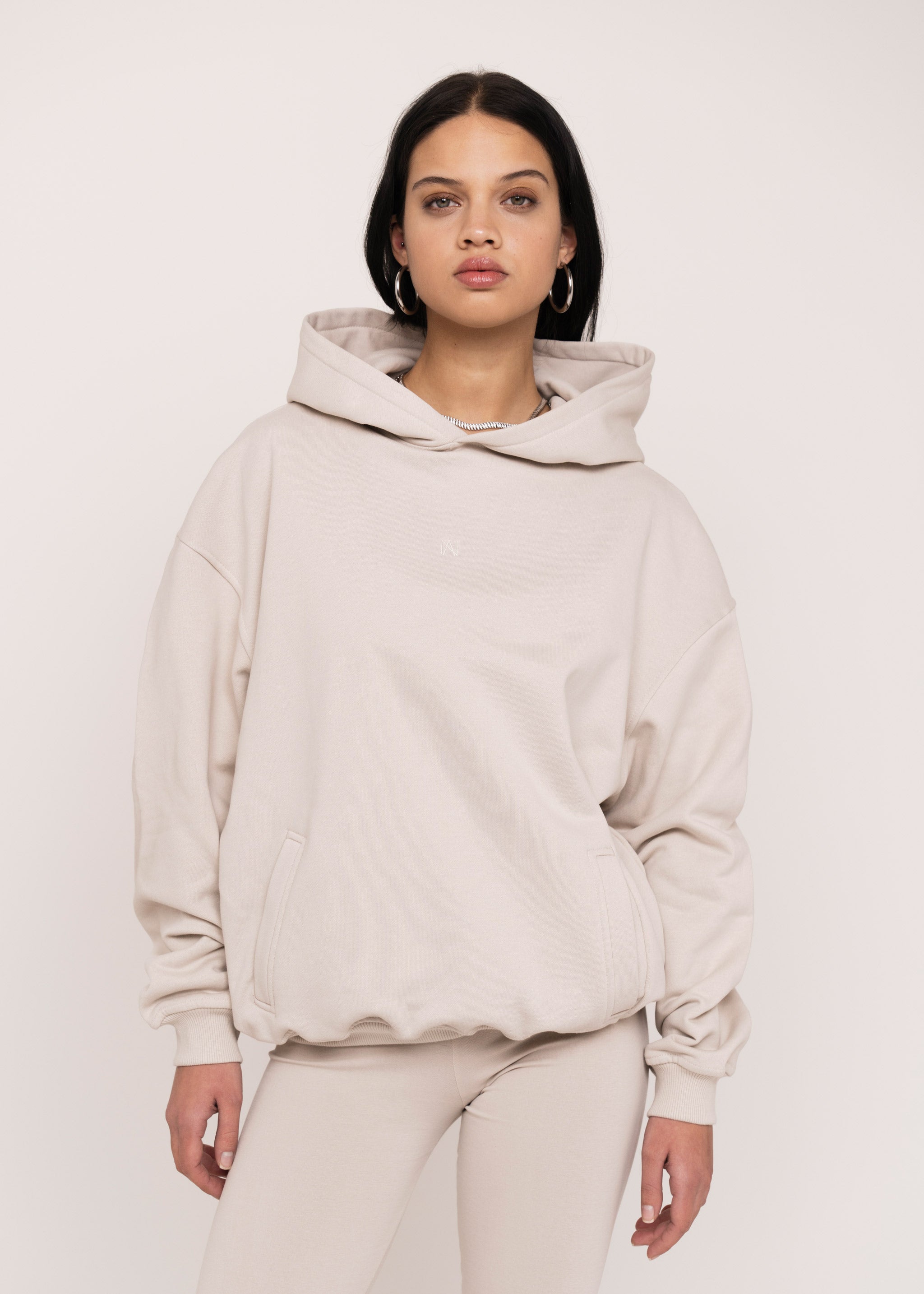 Oversized adjustable hoodie with rib detail around the hem and cuff.