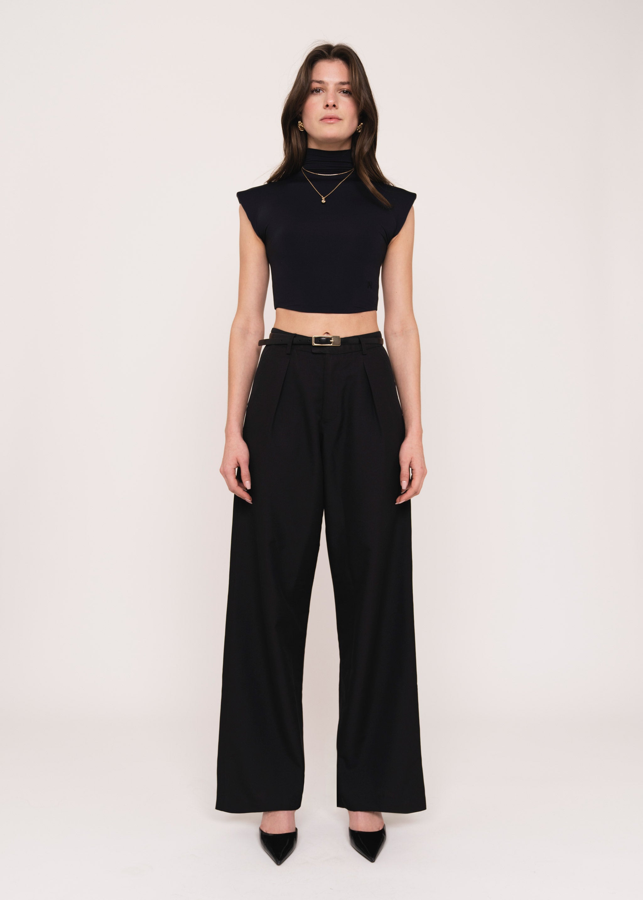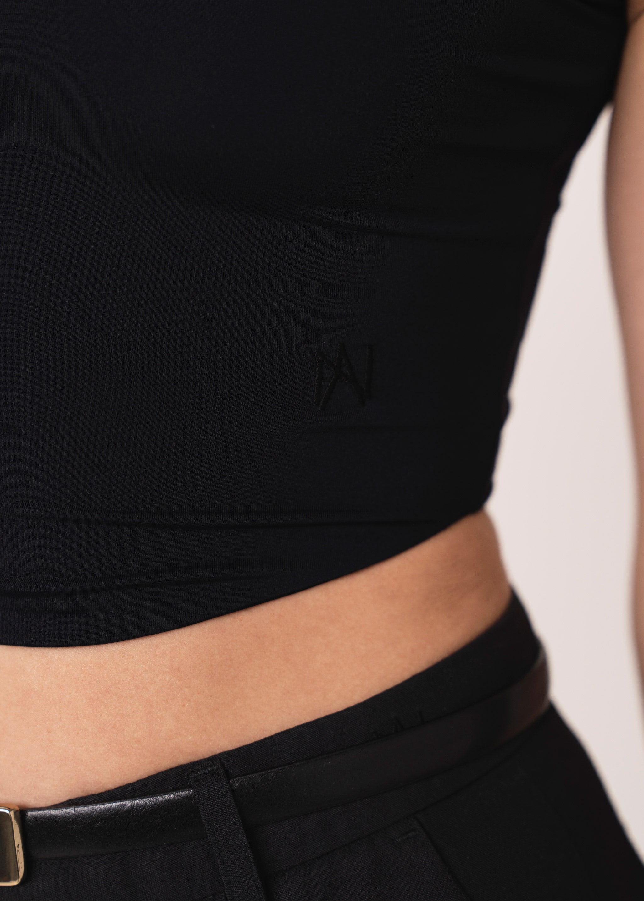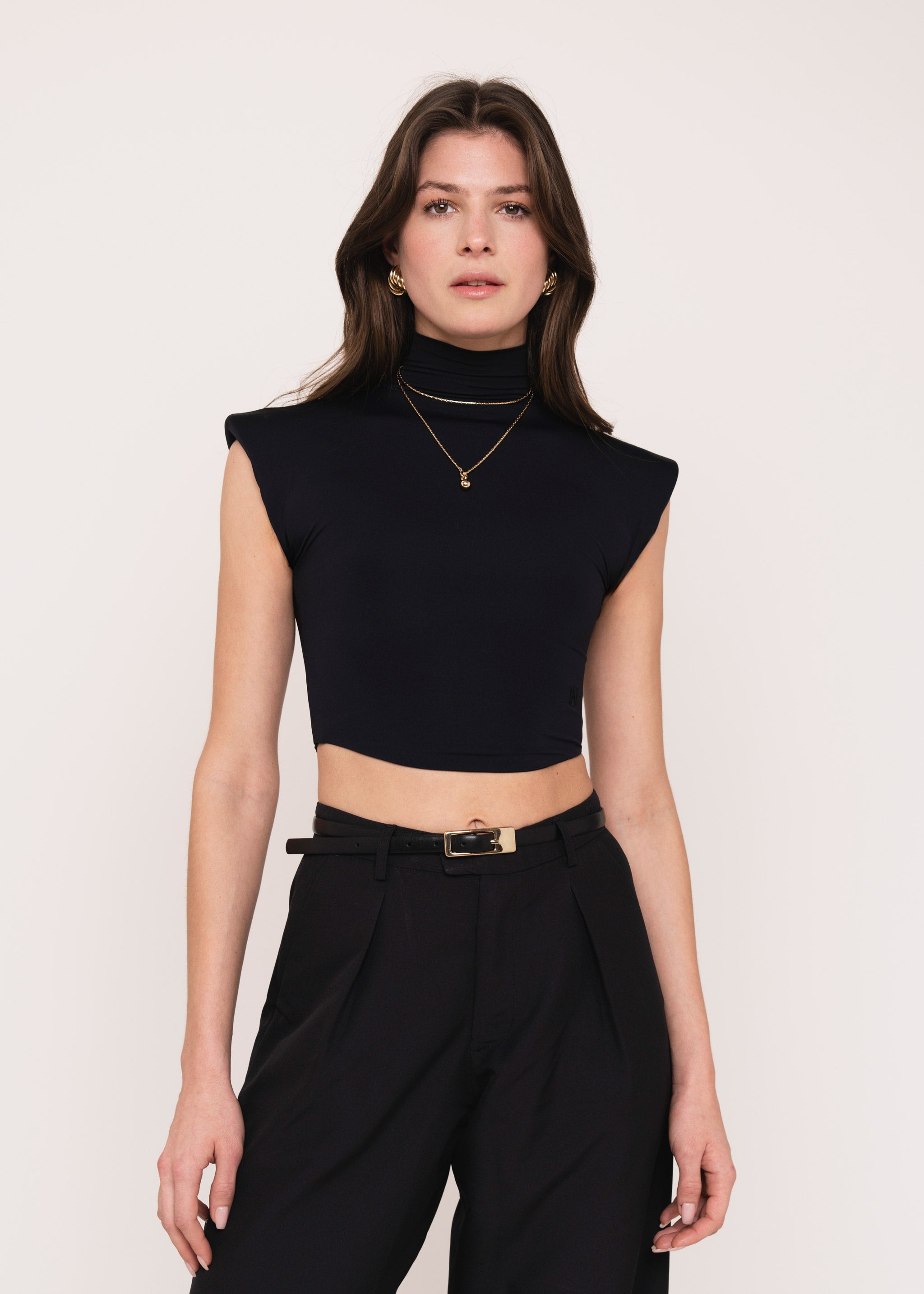 Form-fitting baby tee with shoulder pads, accentuating the silhouette.